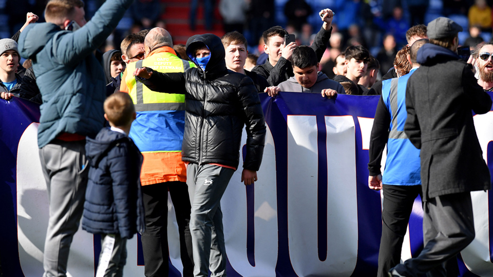 In the second half, with Oldham heading towards non-league football as Barrow and Stevenage led elsewhere, large sections of the crowd ran onto the pitch and unveiled a “Get out of our club” banner directed at owner Abdallah Lemsagam.