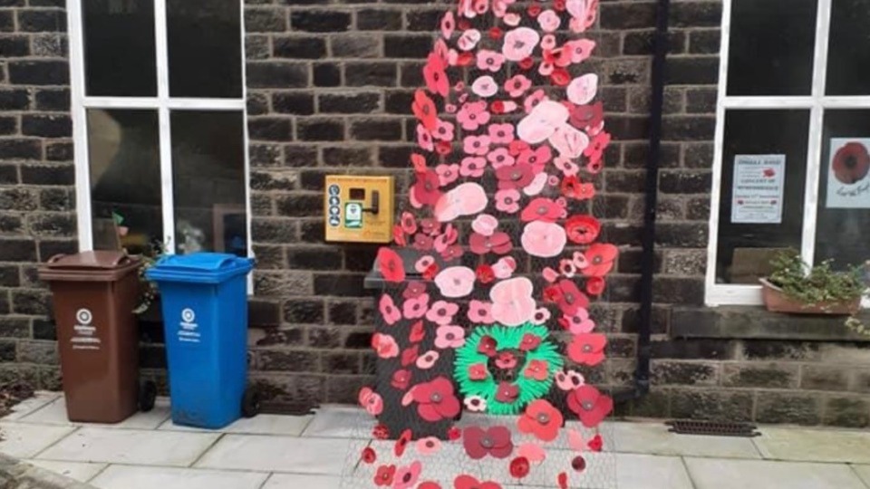 "A big thank you to Gary Tarbuck from Diggle Village Association who fixed the netting to the roof edge for us, and to Diggle Brownies who made lots of poppies and lovely wreath out of their hand shapes, which takes pride of place on the cascade of poppies.
